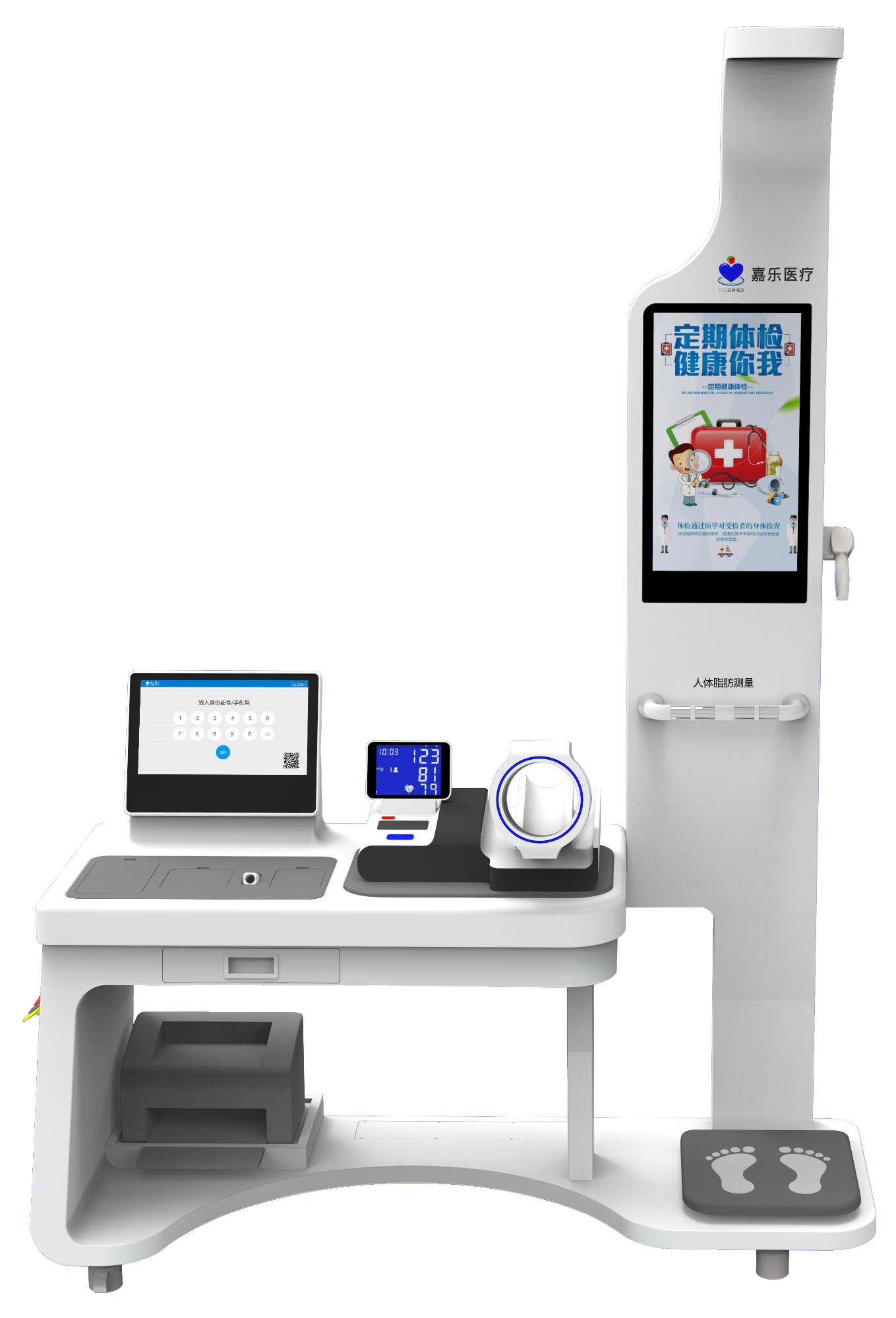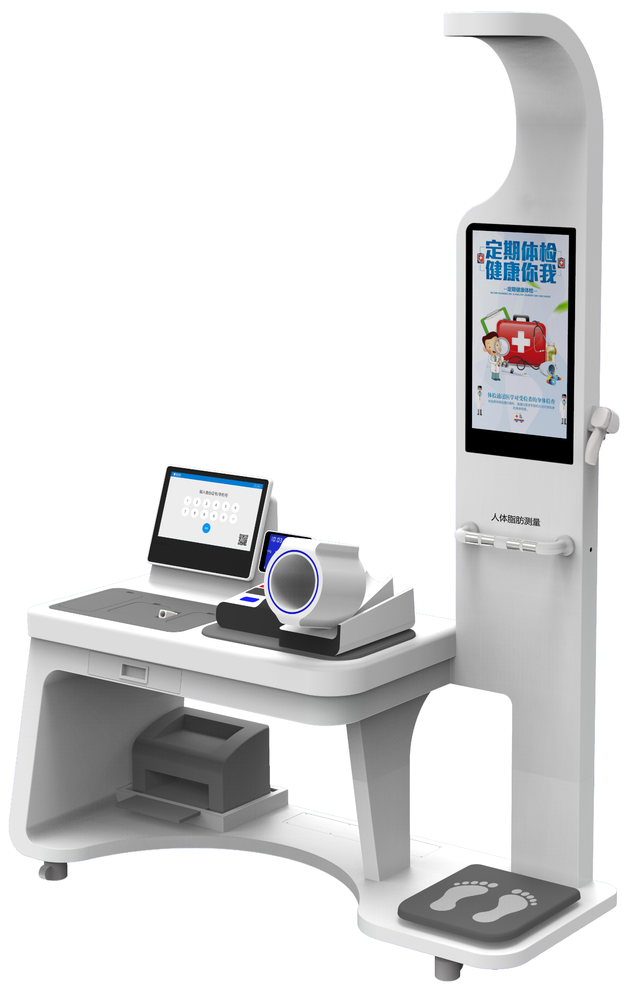 高端配置高度集成一體化設計,健康宣教和自助體檢結合。30多項健康檢測指標。支持多種方式一步自助建檔、快速檢測。自設式流程檢測,采用人機工程學設計,操作自助簡單。健康報告自動生成,健康促進方案引導,快速打印。安裝部署簡單,通電即可使用。